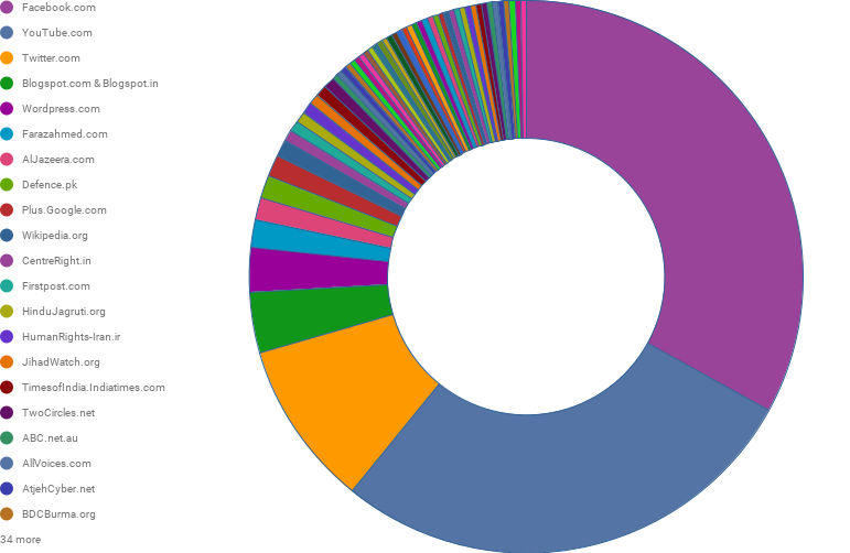 Donut chart showing distribution of website domains, with Facebook.com as the largest share, followed by YouTube.com and Twitter.com, and many smaller segments representing dozens of other sites listed in a legend on the left.
